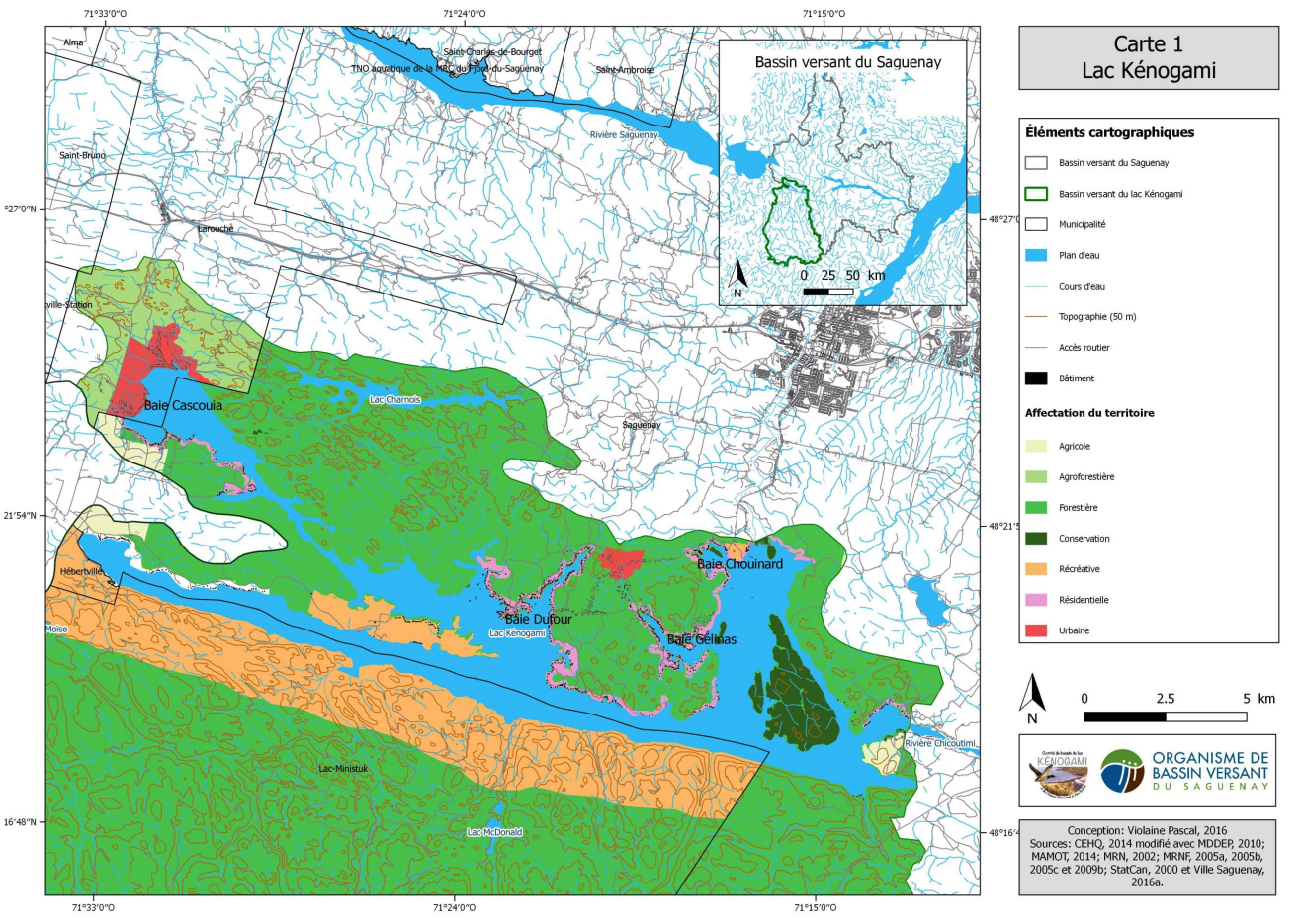 Autour du lac Kénogami et particulièrement dans les baies Cascouia, Dufour, Gélinas et Chouinard, on observe plusieurs interventions humaines qui nuisent à la qualité des bandes riveraines et augmentent l’apport de phosphore dans l’eau du lac: